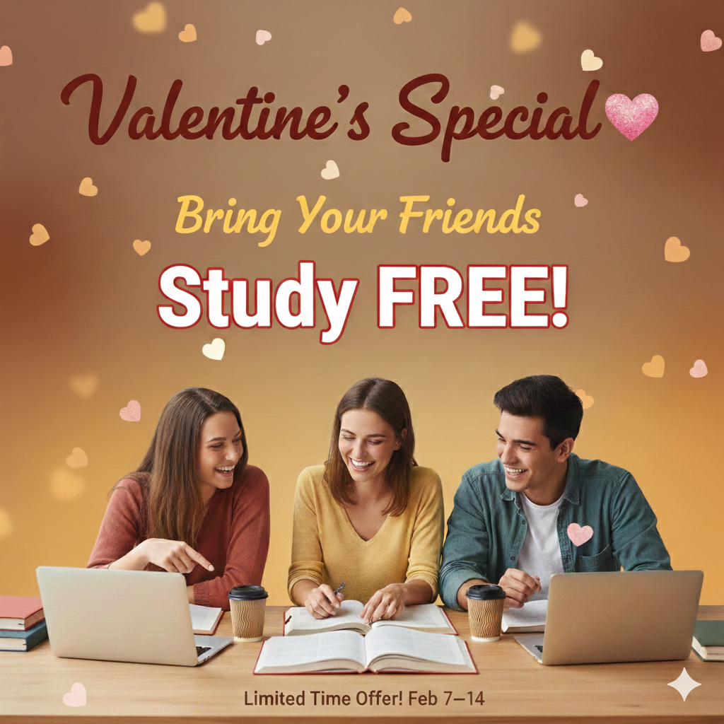 This Valentine’s Day, learning is better when it’s shared. To celebrate connection, friendship, and togetherness, we’re introducing a limited-time Valentine’s Special that lets you study for FREE when you bring your friends along.